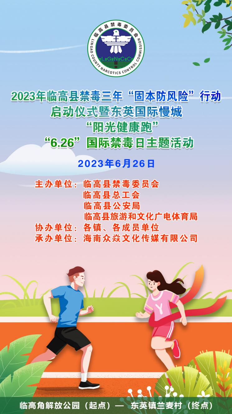 為傳播“健康人生,綠色無毒”理念,6月26日海南省臨高縣將在臨高角解放公園舉行2023年臨高縣禁毒三年“固本防風險”行動啟動儀式暨東英國際慢城“陽光健康跑”“6.26”國際禁毒日主題活動。