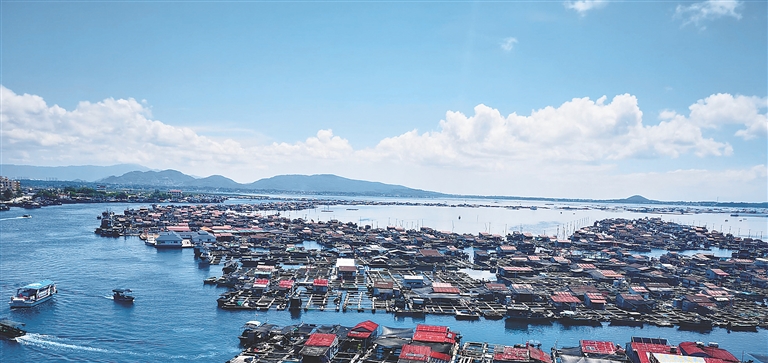 一個個深海網箱滿載豐收,在南灣附近的海域,轉產轉業的漁民忙著往網箱里投喂魚料,“向海而興”是該縣發展農業的一大方向。