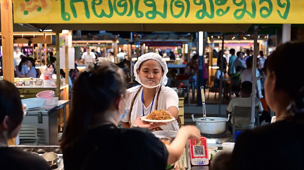 ??诎咨抽T文創市集于今年6月10日正式開業,占地面積約6萬平方米,有著600余個小吃與文創攤位。在美食區的300多家小吃商戶中,160多家小吃由泰國人經營。
