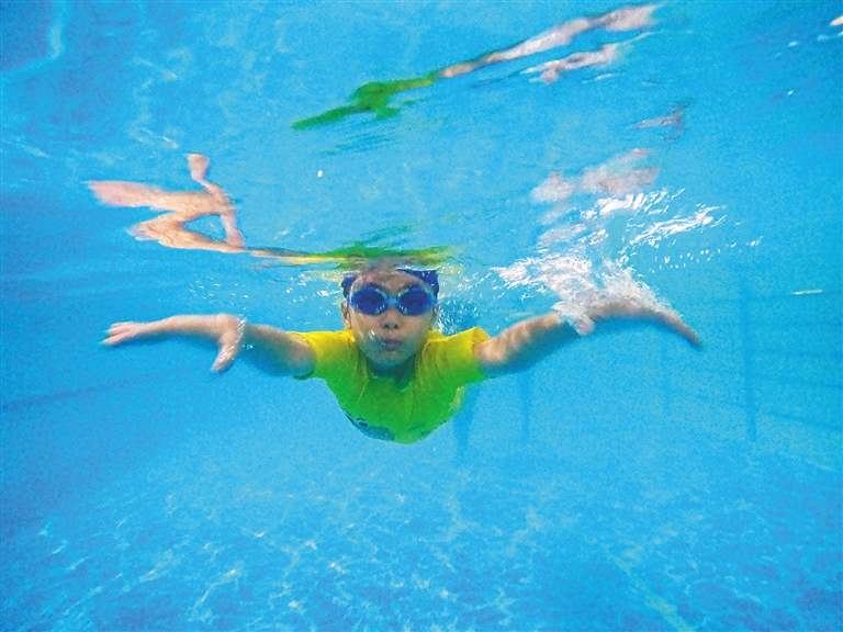 當天,在教練的指導下,東山鎮農場小學四年級學生許備文逐漸掌握了游泳的規范動作,歡快地在50米長的泳池里游了好幾輪?!坝斡境乩锖軟隹?,還有很多小伙伴一起玩耍,今天非常開心?!?/p>
