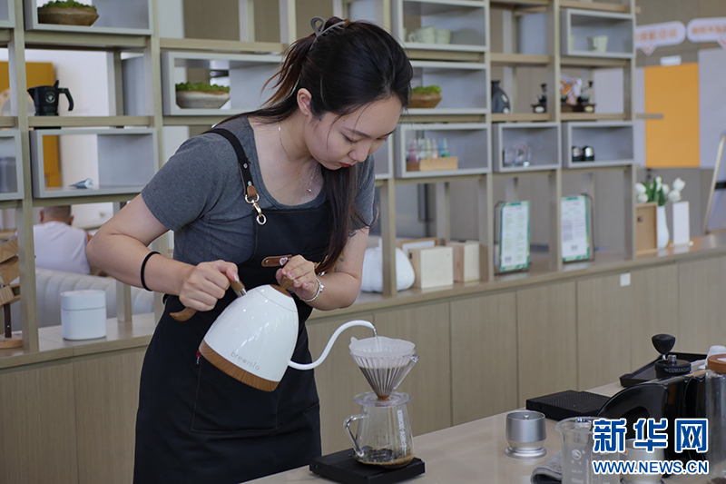 咖啡師現場為采風團成員沖泡咖啡。新華網發(徐淑敏 攝)
