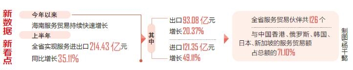 統計數字顯示,今年以來,海南服務貿易持續快速增長。上半年,全省實現服務進出口214.43億元,同比增長35.11%。其中,出口93.08億元,增長20.37%;進口121.35億元,增長49.11%。全省服務貿易伙伴共126個,與中國香港、俄羅斯、韓國、日本、新加坡的服務貿易額占總額的71.10%。