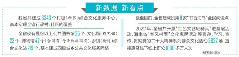 省旅游和文化廣電體育廳相關負責人介紹,從硬件上看,近年來,海南在公共文化基礎設施建設方面不斷增加投入,??跒逞菟囍行?、??谠贫磮D書館、三亞天涯書局、三亞海上書房、五指山市科技館等一批公共文化新空間不斷涌現;省圖書館少年兒童館去年底正式投入使用,構造出具有海南自貿港特色的智慧型少兒閱讀空間;海南十大公共文化設施項目等文化新地標陸續建成;目前我省已有3343個村級(社區)綜合文化服務中心,基本實現全省行政村、社區的覆蓋……公共文化空間既“好看”更“好用”。