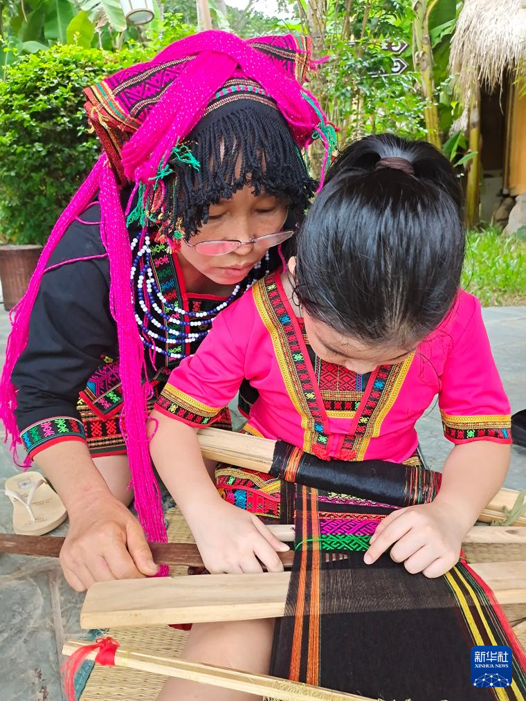 8月19日,小朋友在海南省昌江黎族自治縣王下鄉體驗黎錦編織。(呂慶沼 攝)