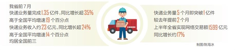 今年,全省快遞業務量5個月即突破1億件,較去年提前2個月。上半年全省實現網絡交易額1599億元,同比增長約17%。一件件快遞包裹,傳遞出強勁的發展動能。