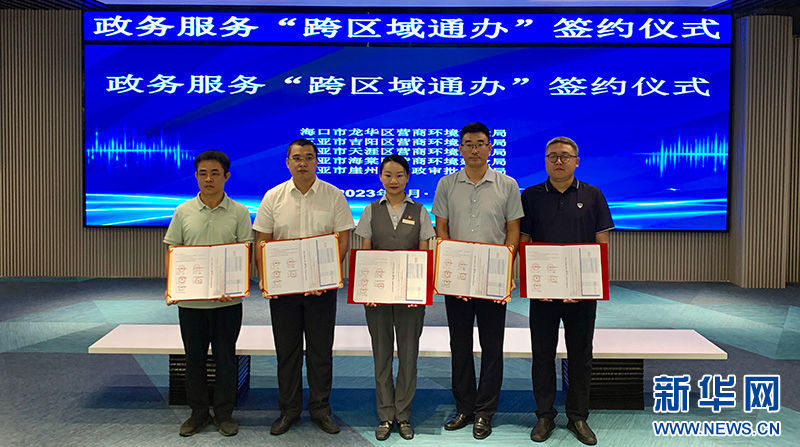 三亞市天涯區營商環境建設局攜手吉陽區、崖州區、海棠區等三區營商環境建設局與??谑旋埲A區營商環境建設局簽訂《政務服務“跨區域通辦”合作協議》。新華網發