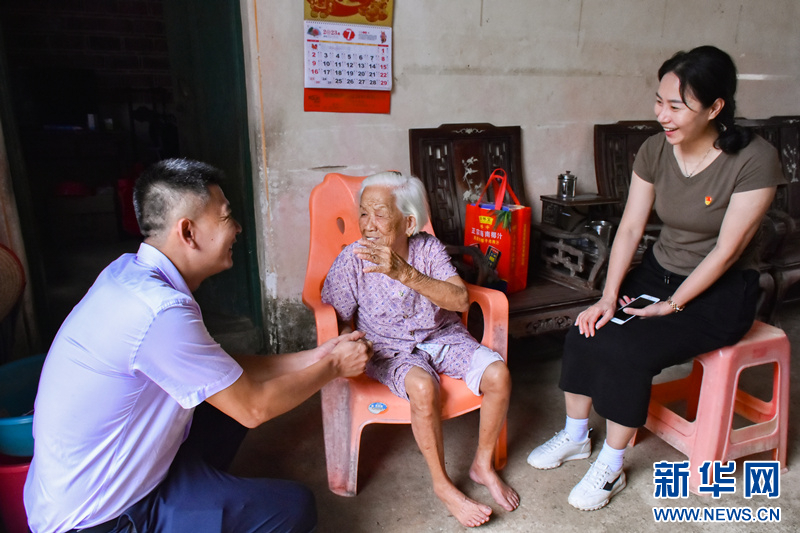 羅菁菁(右)與新任的青山村駐村第一書記一同看望村里的老黨員。新華網發