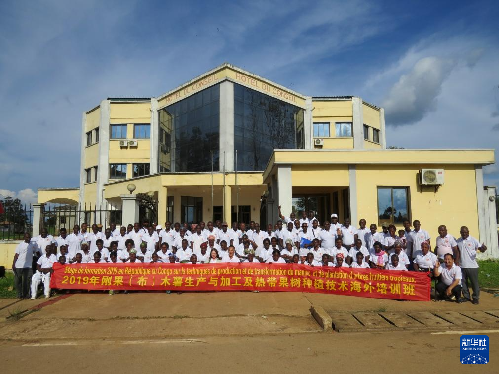 這是2019年11月19日,在剛果(布)首都布拉柴維爾以南17公里的中國援剛果(布)農業技術示范中心,中國熱帶農業科學院專家為當地農民開辦剛果(布)木薯生產與加工及熱帶果樹種植技術海外培訓班時合影留念。新華社發(中國熱帶農業科學院供圖)