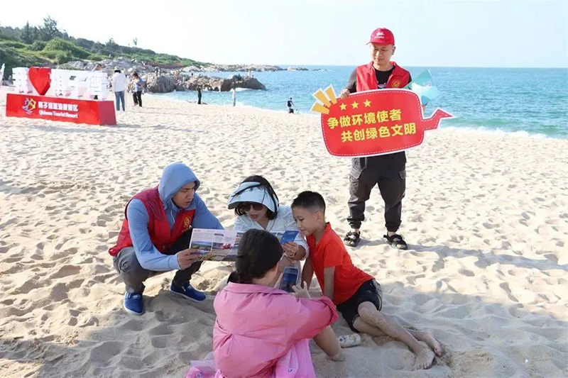 在棋子灣大角公園沙灘上,志愿者手舉文明用語提示牌,為市民游客發放《昌江旅游》等宣傳資料,溫馨提醒市民游客出游時注意安全,不要亂扔垃圾、不要在景區景點亂涂亂畫,共同維護景區景點的良好秩序。