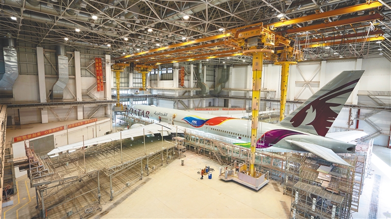 近日,來自卡塔爾航空公司的波音B777-300ER型飛機,在海南自貿港一站式飛機維修產業基地內接受整機噴涂服務。海南日報記者 袁琛 通訊員 張健 圖/文