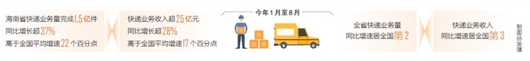 10月15日,海南日報記者從海南省郵政管理局獲悉,今年1月至8月,海南省快遞業務量完成1.5億件,同比增長超37%,高于全國平均增速22個百分點;快遞業務收入超25億元,同比增長超28%,高于全國平均增速17個百分點,全省快遞業務量同比增速居全國第2,快遞業務收入同比增速居全國第3。