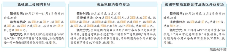 海南日報記者從??谑猩虅站肢@悉,??趯l放750萬元政府消費券,10月27日起開搶。本輪消費券發放涵蓋免稅線上會員購專場、離島免稅消費券專場、第四季度商業綜合體及街區開業專場,共發放3.12萬張專場消費券。(記者郭萃)