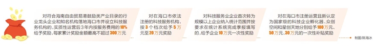 在支持科技創新創業平臺建設方面,在??谑凶赃\營且新認定為國家級的科技企業孵化器、眾創空間和星創天地分別給予100萬元、50萬元、30萬元的一次性補貼獎勵。