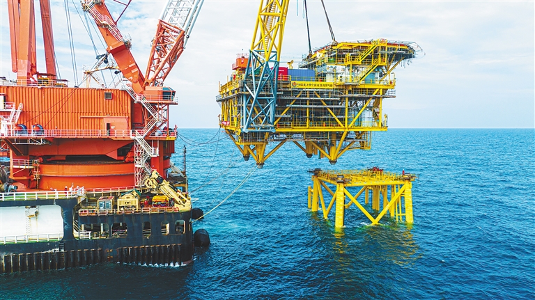 “平臺海上安裝作業很像搭積木,但要確保大重量的吊物在海洋風、浪、流的共同作用影響下,精準就位、一擊即中?!敝袊S蜆窎|10-1氣田開發項目現場首席工程師喻發令介紹,平臺由導管架和上部組塊兩部分共同構成,總重量約9200噸。其中導管架是“基座”,采用“臥式建造、拖拉裝船、吊裝下水、充水扶正”的施工方案安裝,已經于10月完成固定;平臺上部組塊由“海洋石油201”鋪管起重船吊裝至導管架上方,緩慢下放完成對接。