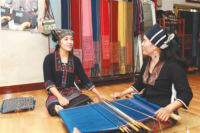 日前,位于東方市東河鎮玉龍村的白玲黎錦專業合作社,符現相(右)與長女符仁玲一起織錦。海南日報記者 陳若龍 攝