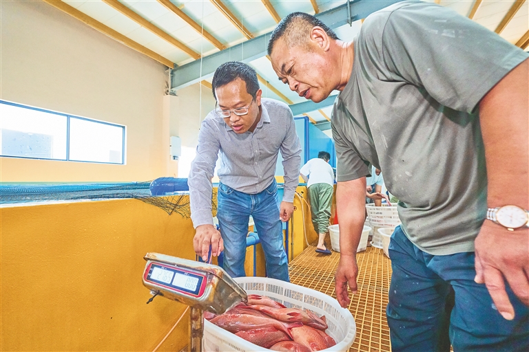 楊昌裕在進入車間工作前,也是當地一名養殖戶。他注意到,傳統的養殖更加粗放,受季節影響比較大,病害也難以預防,東星斑魚苗的成活率僅有六七成,“但在車間里飼養的東星斑,有了技術等加持,其成活率高達95%,且養殖時間縮短一半,產量提高了3到5倍?!?/p>