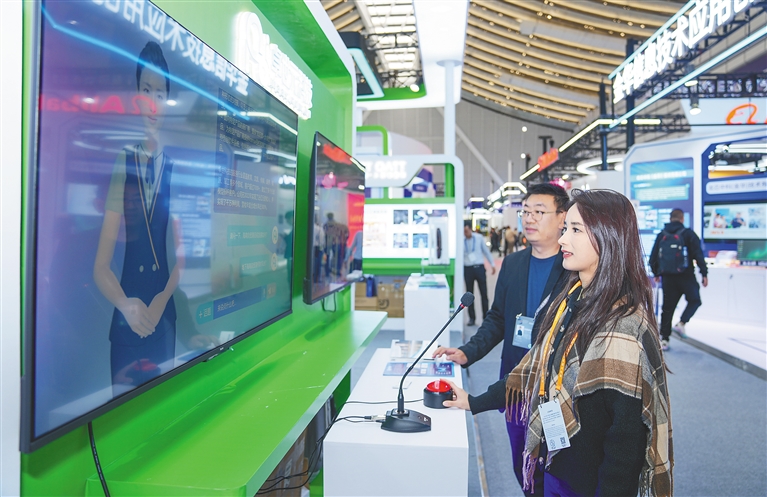 在2023年世界互聯網大會“互聯網之光”博覽會上,媒體記者在卓世科技(海南)有限公司展臺與虛擬人物互動。