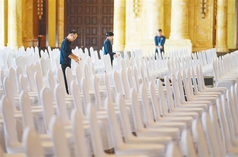 展廳內,工作人員正在擺放座椅。 海南日報記者 李天平 攝