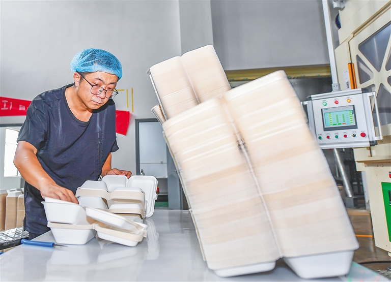 在海南大勝達紙漿模塑環保餐具智能研發生產基地,工作人員正在檢查環保餐具質量。海南日報記者 袁琛 攝