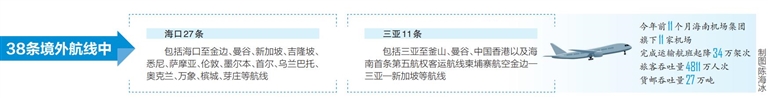 其中???7條、三亞11條,包括??谥两疬?、曼谷、新加坡、吉隆坡、悉尼、薩摩亞、倫敦、墨爾本、首爾、烏蘭巴托、奧克蘭、萬象、檳城、芽莊等航線,三亞至釜山、曼谷、中國香港以及海南首條第五航權客運航線柬埔寨航空金邊—三亞—新加坡等航線。