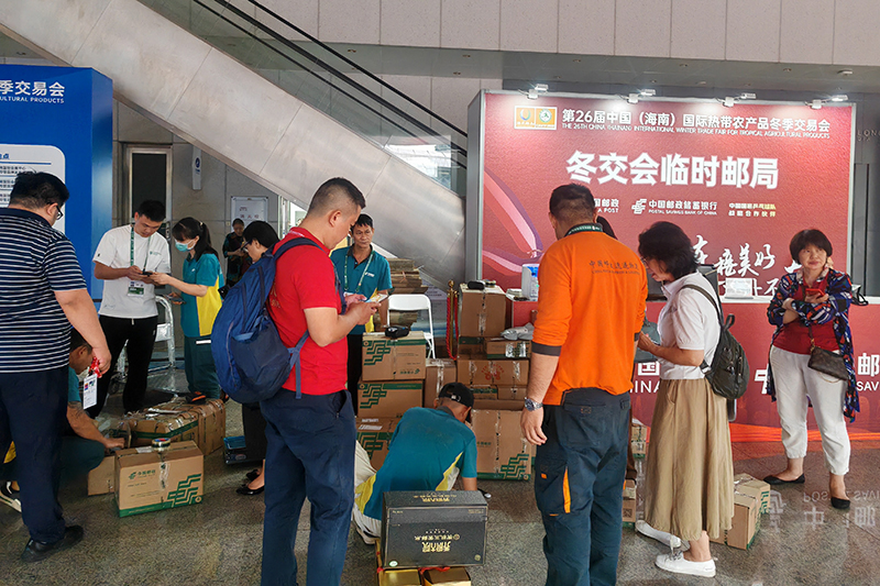 除了臨時郵局的駐點服務外,??谑蟹止具€組建了20余人的營銷攬投團隊,為展館內的各參展商提供上門收寄服務,進一步擴大寄遞服務覆蓋面。