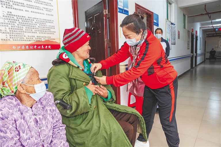 在白沙黎族自治縣農村中心養老院,工作人員為老人穿好厚衣服。海南日報記者 李天平 攝