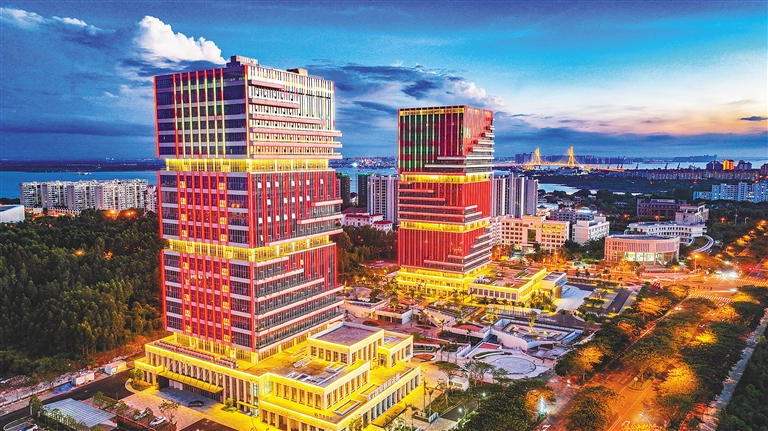 航拍位于儋州洋浦東部生活區新英灣大道的洋浦國際航運大廈。(資料圖)