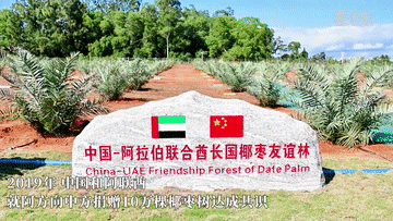 “中國—阿拉伯聯合酋長國椰棗友誼林”里的椰棗樹整齊排列、長勢良好
