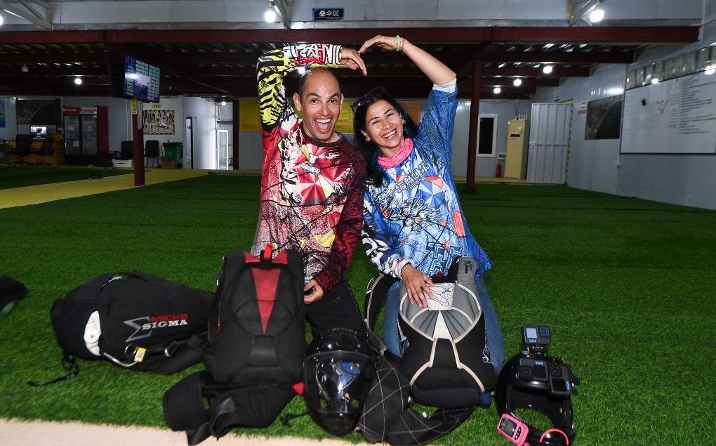 高空跳傘教練娜塔麗(右)和維克多在跳傘基地合影(1月9日攝)。新華社記者 楊冠宇 攝