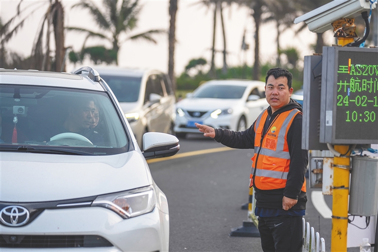 二月十一日,在??谛潞8鄹浇?,志愿者在疏導出島車輛,暢通游客出島路。海南日報記者 李天平 攝
