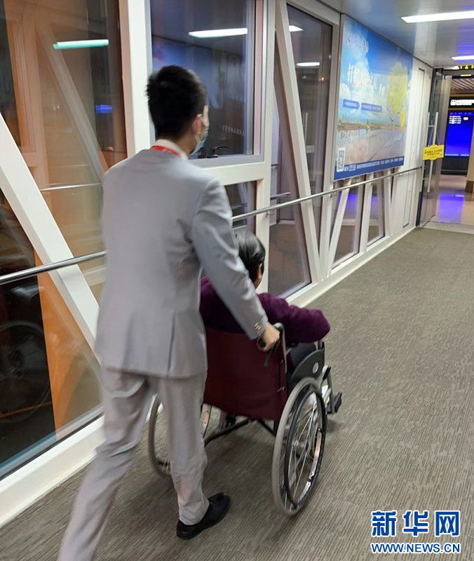 機場急救人員攙扶老人走出客艙。新華網發