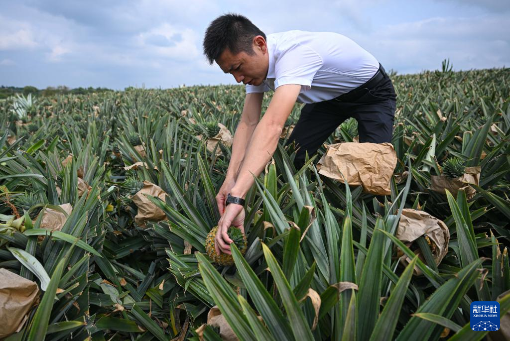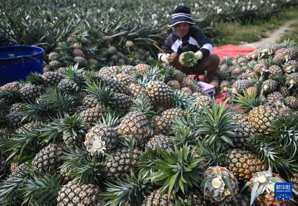 3月18日,村民在海南省文昌市錦山鎮花園村采收鳳梨。新華社記者 蒲曉旭 攝