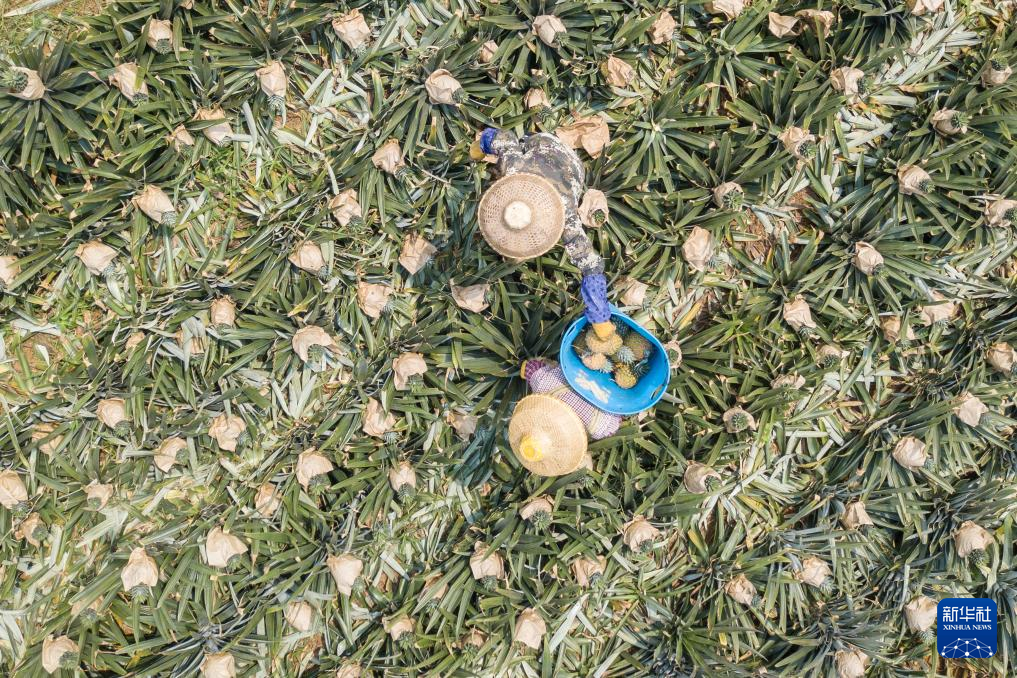 3月18日,村民在海南省文昌市錦山鎮花園村采收鳳梨(無人機照片)。新華社記者 蒲曉旭 攝