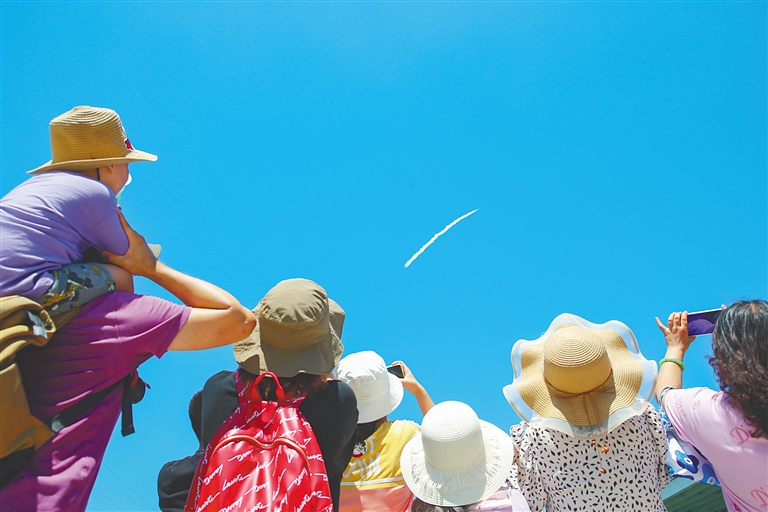 市民游客在文昌清瀾大橋橋頭公園觀看火箭發射。海南日報記者 王程龍 攝