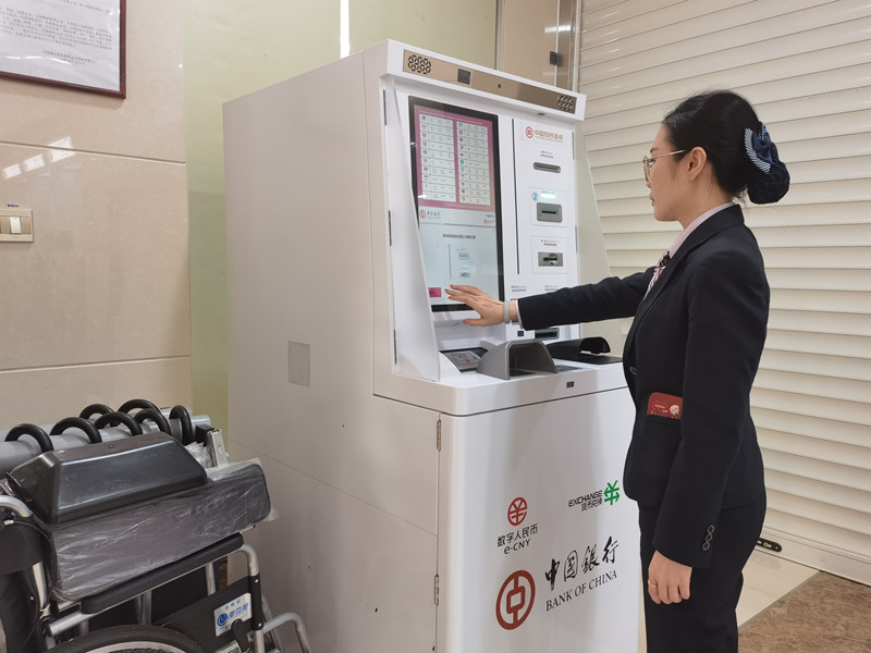 中國銀行博鰲支行工作人員演示數字人民幣外幣兌換機使用方法。新華網發