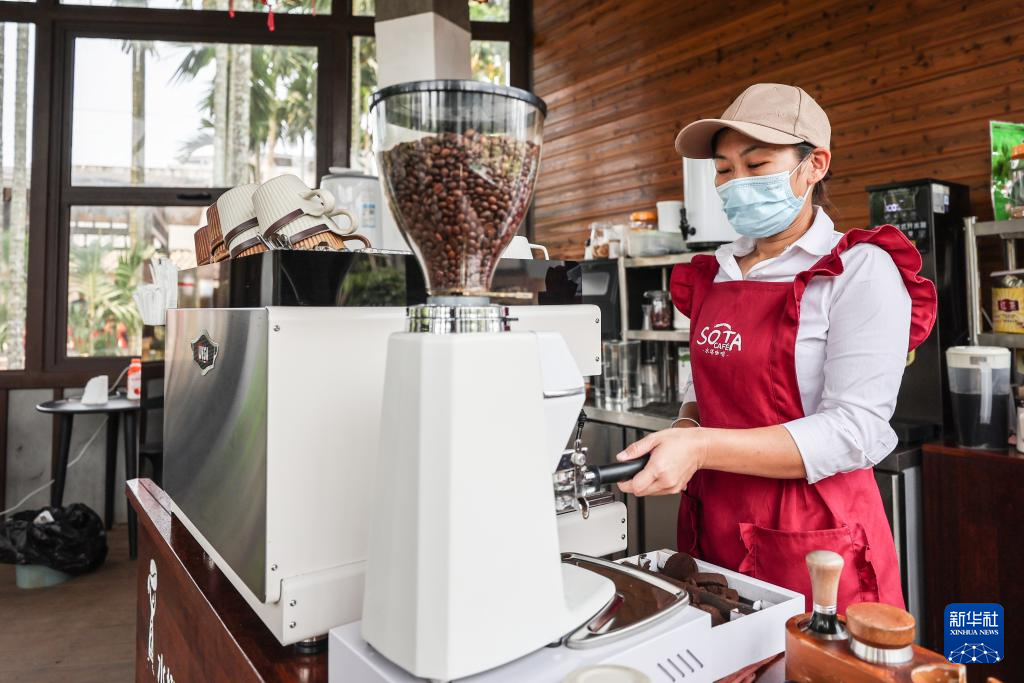 4月3日,海南定安和梅村水塔咖啡屋的店員在制作飲品。新華社記者 張麗蕓 攝
