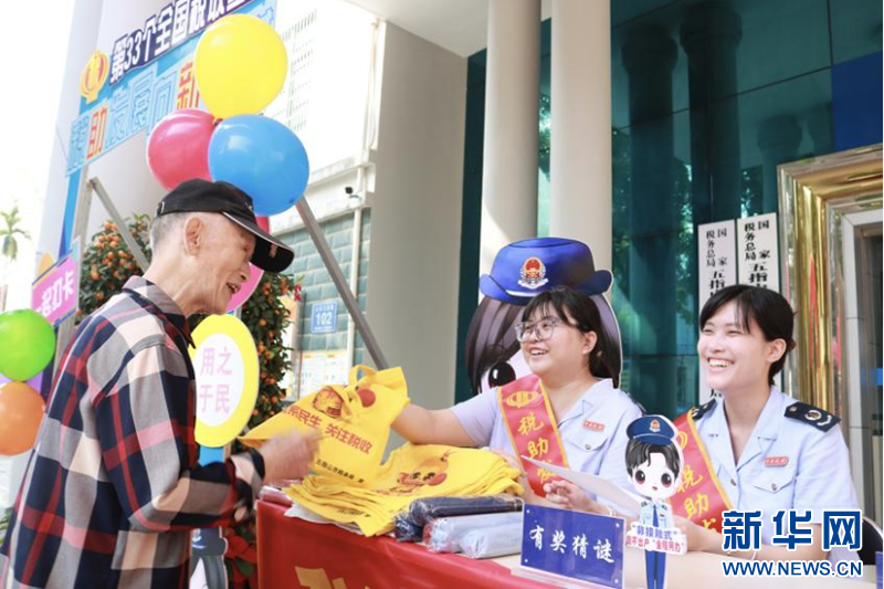 五指山市稅務局干部為參與稅收知識猜謎活動的群眾發放宣傳獎品。新華網發