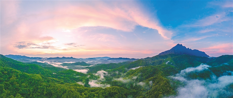 近日,一場春雨過后,海南熱帶雨林國家公園五指山片區山間云霧繚繞,映照著傍晚的滿天霞光,美景令人陶醉。海南日報記者 李天平 攝