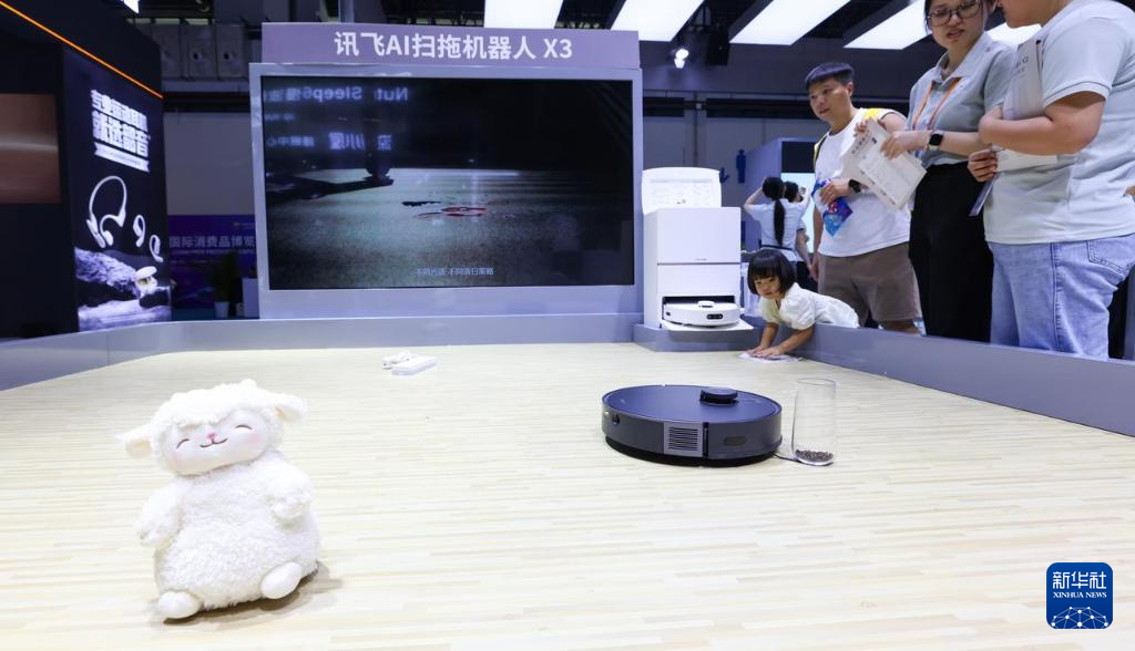 在1號館數字和服務消費展區,科大訊飛股份有限公司一款“說哪到哪”“指哪掃哪”的AI掃拖機器人引來眾多客商駐足。該產品在行進過程中遇到液體污漬會自動倒車清掃、先拖后掃。