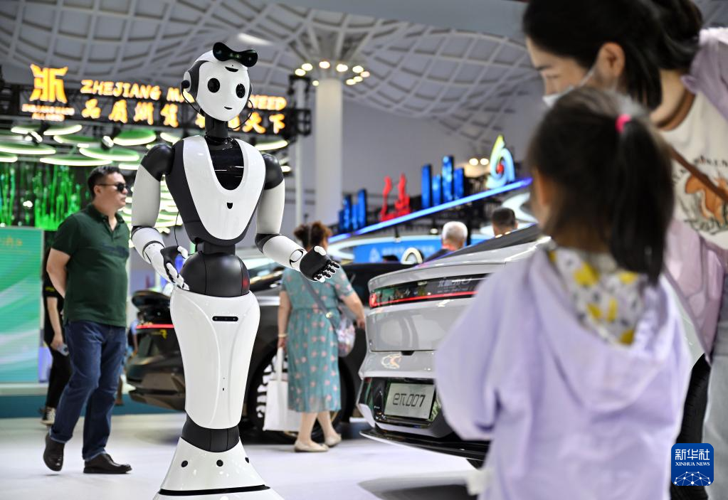 4月15日,第四屆消博會湖北展館的一臺AI人形智能服務機器人在與觀眾互動。新華社記者 郭程 攝