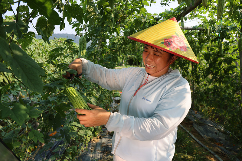 農民在種植基地里采摘苦瓜。新華網發