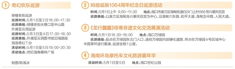 海南日報記者4月27日從??谑新梦木肢@悉,“五一”假期,??趯⑴e辦四大主題巡游活動,包括節奏活潑的奇幻歡樂巡游、非遺文化交流展演、摩托車文化旅游嘉年華,還有火爆全網的潮汕英歌舞等。