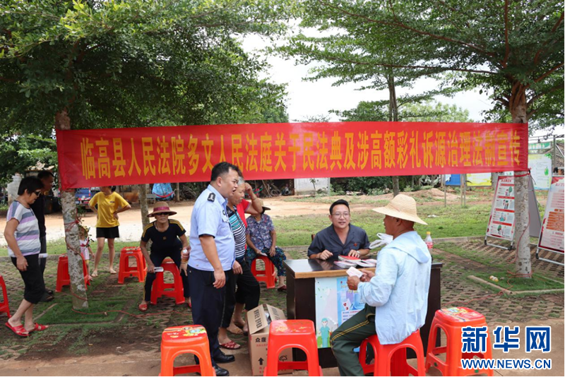 臨高縣人民法院多文人民法庭干警于5月9日上午到頭神村委會開展高額彩禮訴源治理普法宣傳活動。引導廣大群眾共同抵制陳規陋習,遏制高額彩禮之風,培育婚嫁文明新風。