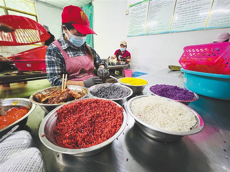 “五色飯變涼會發硬,做成粽子后很好地解決了這個問題?!崩钇G說,隨著物質生活的豐富,苗村里的年輕人吃五色飯少了。同時,由于五色飯的制作工藝復雜,苗家人一般在重大節日才會制作?!拔迳堊龀闪唆兆雍?,再次讓傳統苗族食物走進年輕人的視野。傳統美食文化也在產業發展中得以傳承?!?/p>