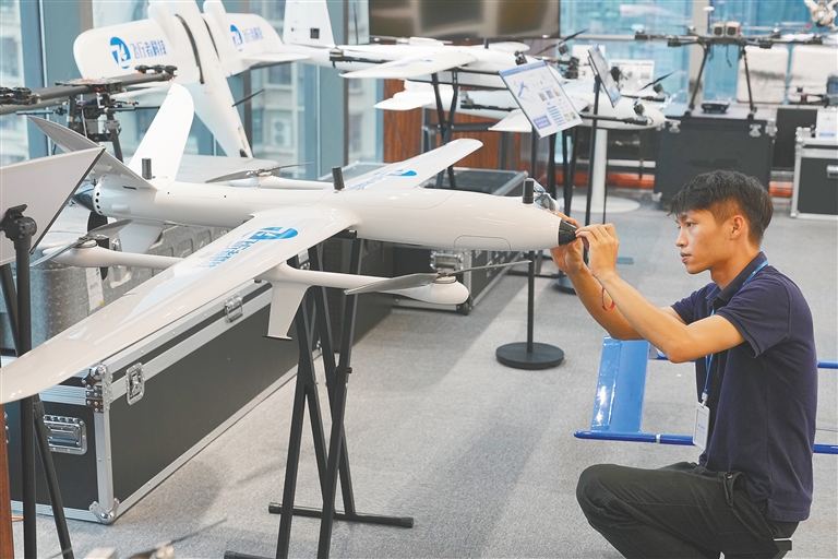近日,在海南飛行者科技有限公司,工作人員展示自主研發的無人機產品。海南日報記者 張茂 攝