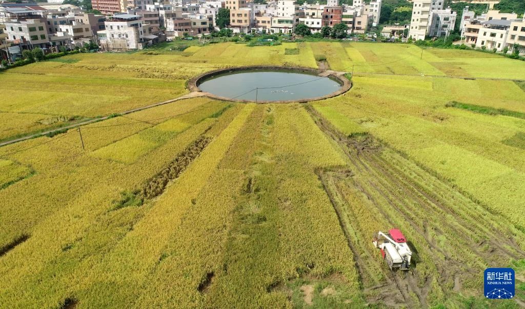 6月12日,收割機在海南省??谑虚L流鎮文毓村的稻田作業。新華社發