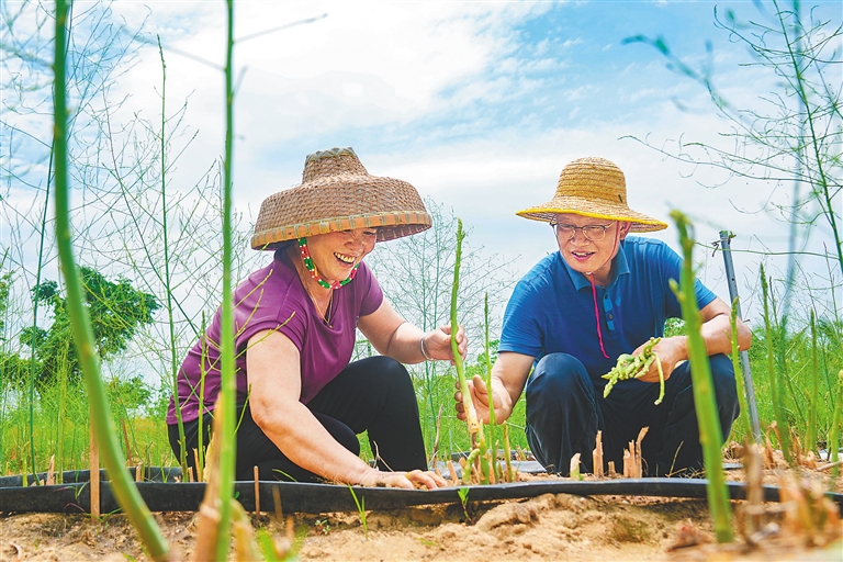 日前,在三亞市崖州區臨高村,“博士村長”易克賢(右)幫助農戶種植蘆筍。海南日報記者 王程龍 攝