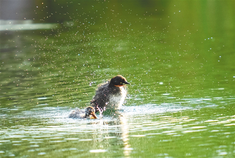 近日,在??谖餍愎珗@人工湖,國家“三有”(有重要生態、科學、社會價值)保護動物小鸊鷉 (pì tī)自由自在地嬉戲。