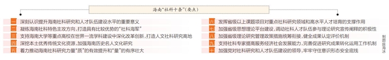 會議發布海南“社科十條”,內容包括深刻認識提升海南社科研究和人才隊伍建設水平的重要意義;凝練海南社科特色主攻方向,打造具有比較優勢的“社科海軍”;支持海南大學等重點高校在世界一流學科建設中深化改革創新,打造人文社科研究高地等。
