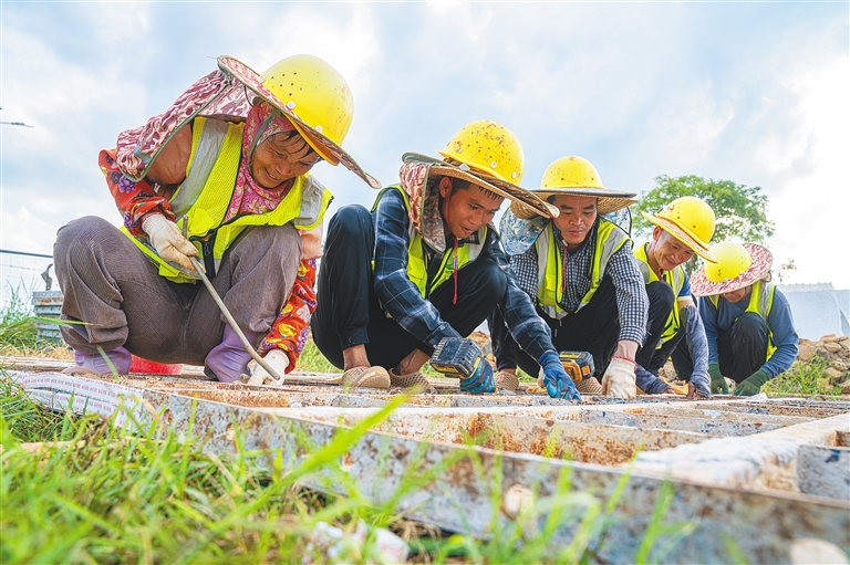 近日,定安縣定城鎮巡崖村南渡江畔,海南省南渡江防洪堤工程(定安巡崖村段)施工現場,工人正在進行支模板、拼裝模板施工。
